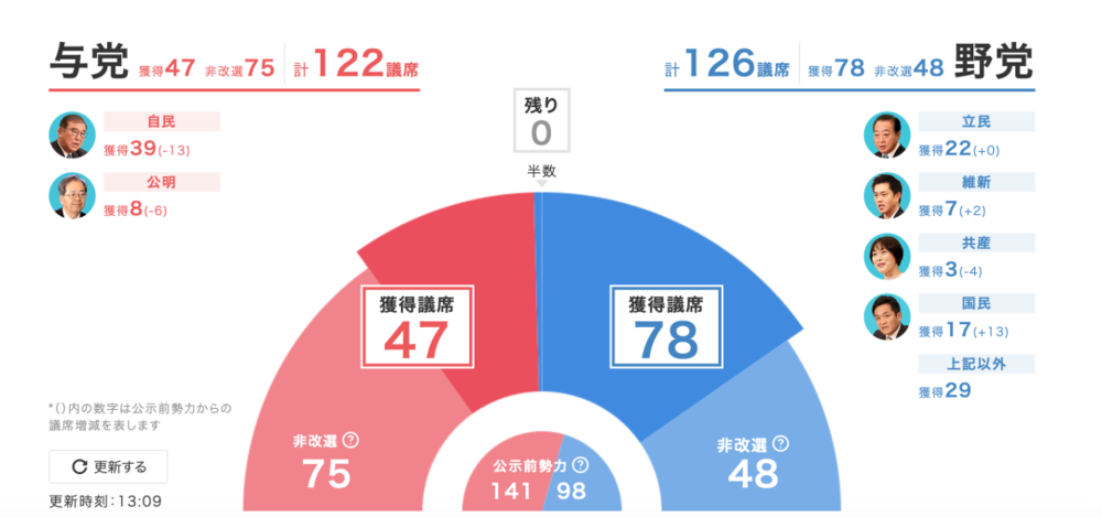 日本国会参议院设有248个议席,议员任期六年,每三年改选一半。此次选举共争夺125个议席,包括74个选区议席、50个比例代表议席和1个补选议席。最终,多个在野党共获得78个议席,加上48个非改选议席,达到参议院248个总议席的一半。而自民党和公明党共获得47席,加上75个非改选议席,达到122席。这一数字较改选前的141席大幅减少。