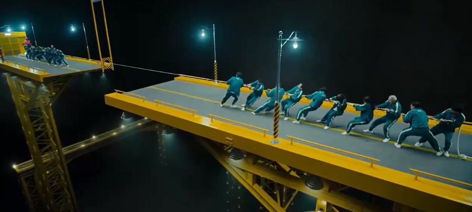 说到场地,就不得不说起《鱿鱼游戏》里的压轴环节——过玻璃桥。