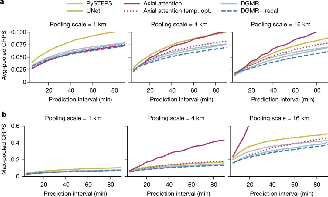 对于概率验证来说,下图中b显示了平均和最大降水率聚集在越来越大的区域31的CRPS。当在网格分辨率水平上测量时,DGMR、PySTEPS和轴向注意力的表现相似。