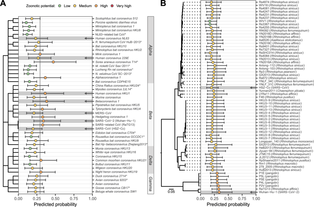 在模型分析结果中,大多数基因组(85.5%)被归类为具有中等人畜共患病潜力,然而,严重急性呼吸系统综合症冠状病毒 2(SARS-CoV-2)、来自蝙蝠的密切相关的病毒 RaTG13,以及所有5种密切相关的穿山甲相关分离物的检测结果都预测具有很高的人畜共患病潜力。