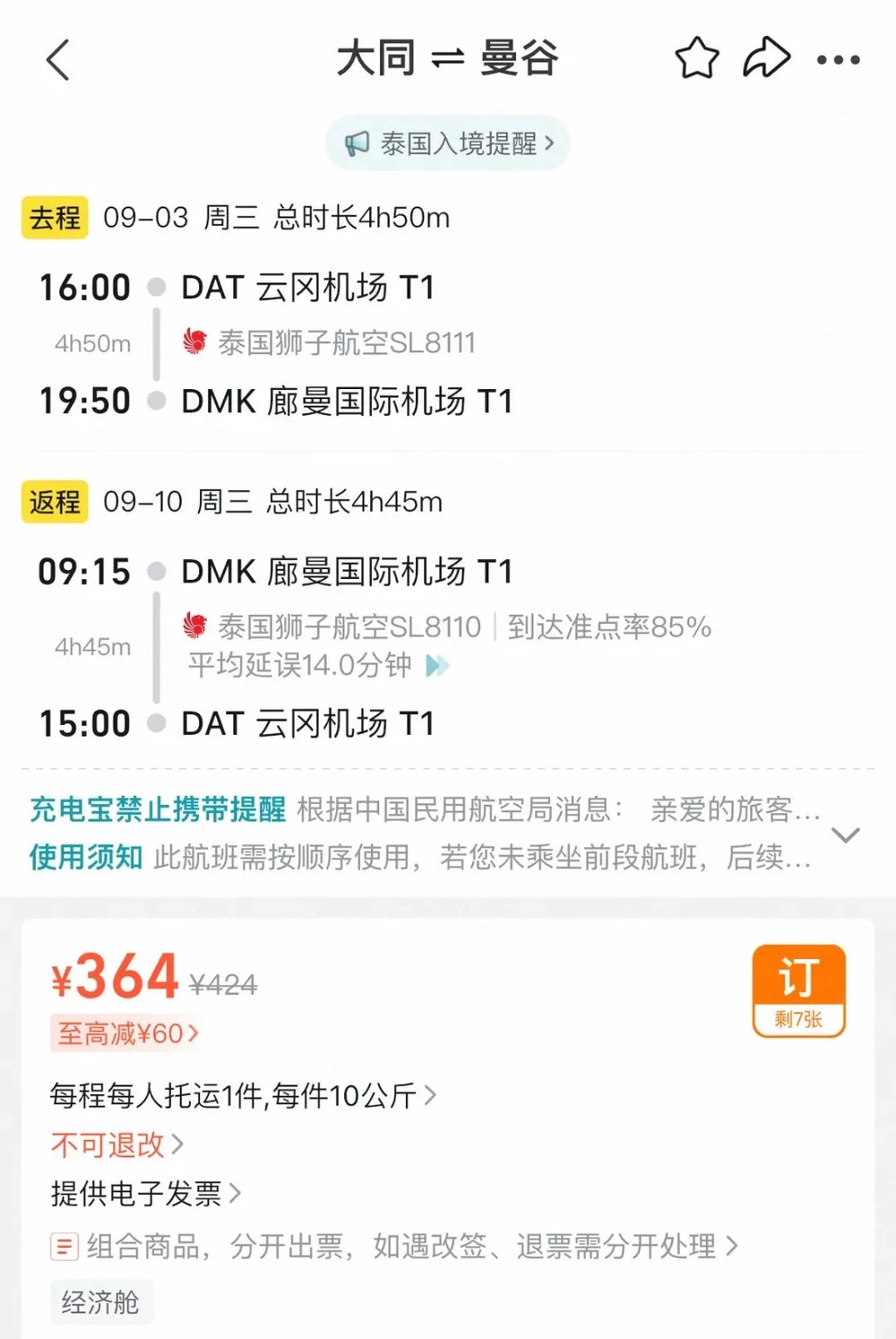 至于往返,云冈国际机场也有大同-曼谷含税364元的组合,时间还特友好,既不是红眼航班,也不用凌晨起床赶飞机。