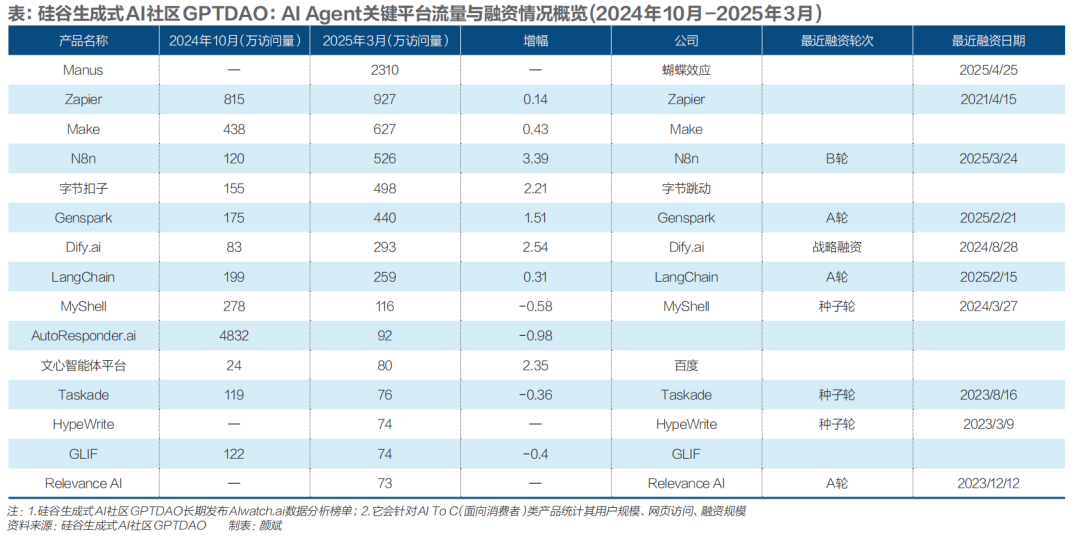 字节跳动、百度都是目前最有热情投入Agent的重要中国玩家。字节跳动的扣子、百度的文心智能体平台半年内访问量均增长超过200%;另外,国际知名的AI Agent平台N8n、LangChain用户访问大幅增长的同时,还分别取得了新一轮融资。