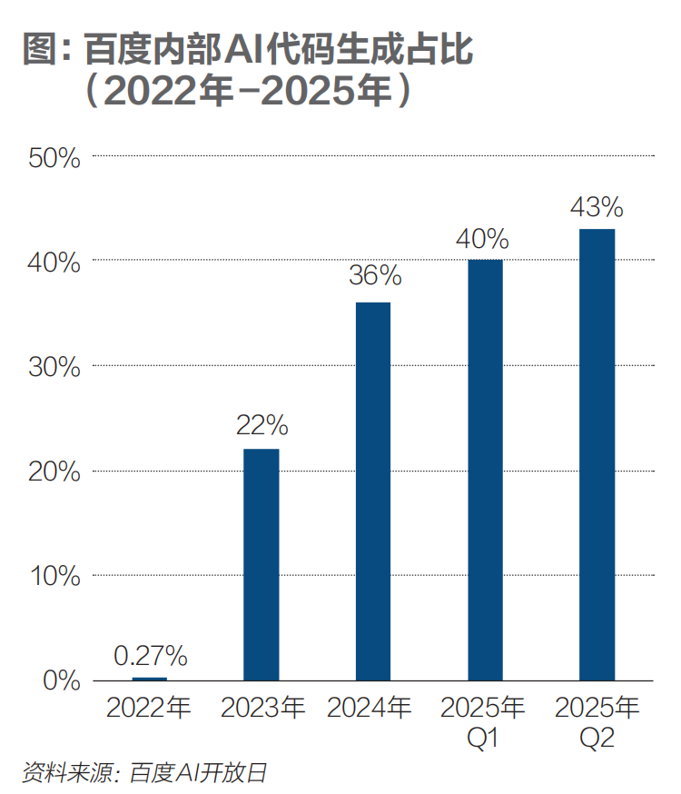 百度在6月23日的AI开放日上披露,百度内部由AI生成的代码所占比例逐年大幅提升。2022年这一数据仅为0.27%,2025年二季度这一数据超过43%。百度内部深度使用文心快码的工程师,代码提交量相较于不使用的工程师提升了近70%。