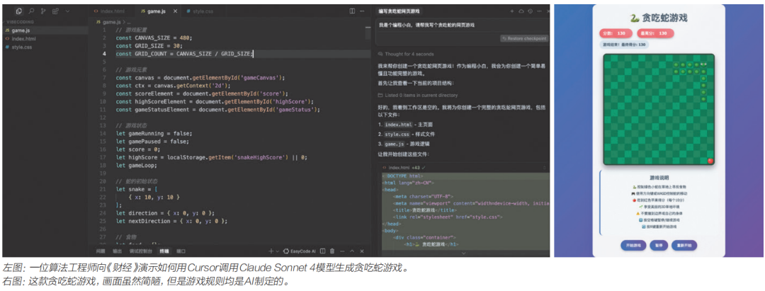 一位医疗硬件创业公司的资深算法工程师认为,上述数据不夸张,目前他日常工作中,80%的代码都是AI生成的。他向《财经》演示,如何使用AI代码生成工具Cursor调用Claude Sonnet 4模型生成并修改一款网页游戏的全过程。在演示过程中,Cursor运行Agent仅用一分钟就生成了三个文件,并最终在网页上跑起了贪吃蛇游戏。