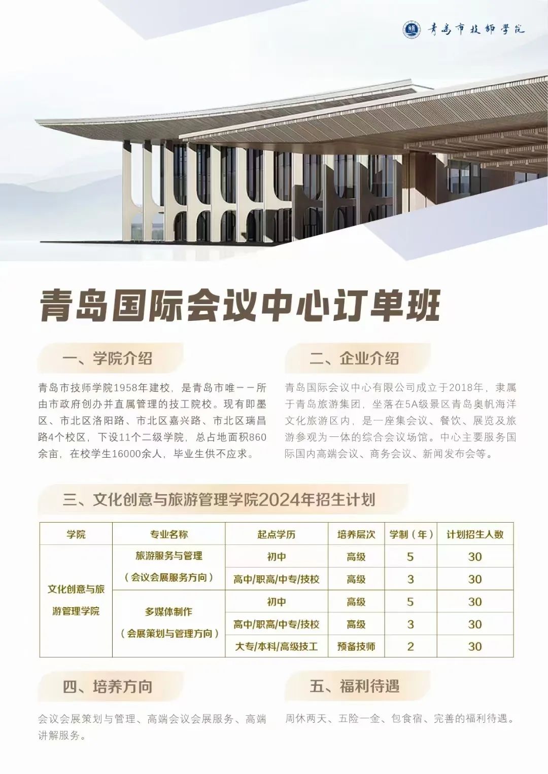 他报读的多媒体制作专业,又叫作“青岛国际会议中心订单班”,宣传页上,一边是学校的介绍,一边是对青岛国际会议中心的介绍。长河选的多媒体制作专业上,招收的学生为大专生、本科生和高级技工,学制为1+1,毕业后学生会拿到预备技师的资格证,相当于本科学历。在福利待遇那一行,则写着周休两天,五险一金,包食宿,以及完善的福利待遇。