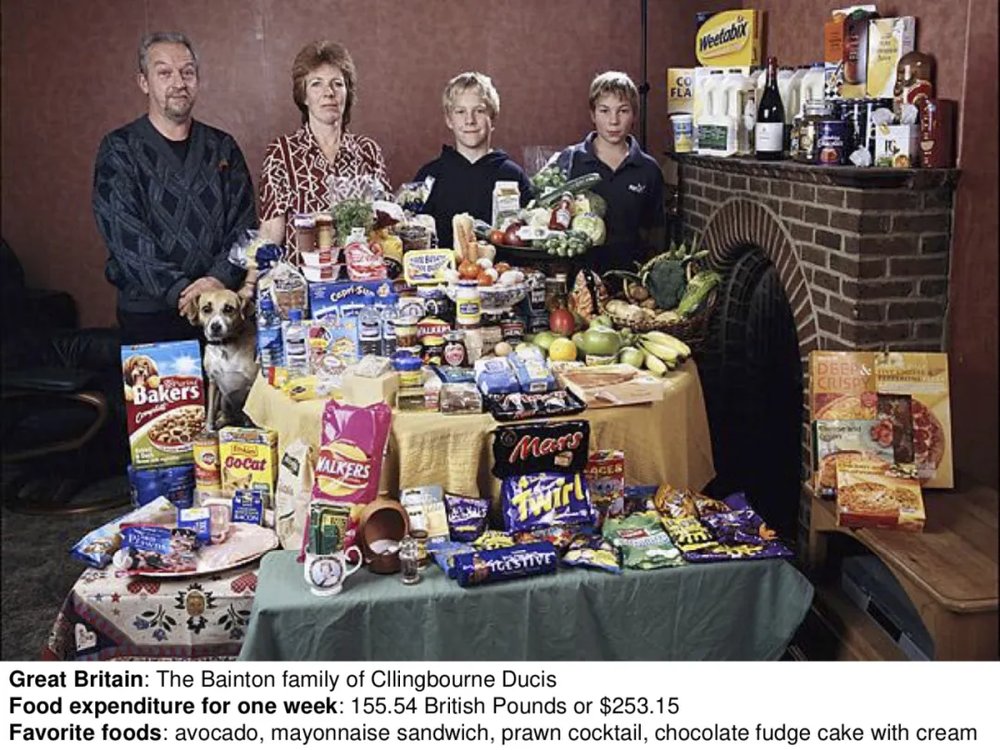 ◉2005年,美国摄影师Peter Menzel and Faith D’Aluisio走遍全球24个国家,拍摄了30个家庭的日常餐桌。图示为当年英国家庭一周的食物构成,大部分都是超加工食品。图源:SciSpace