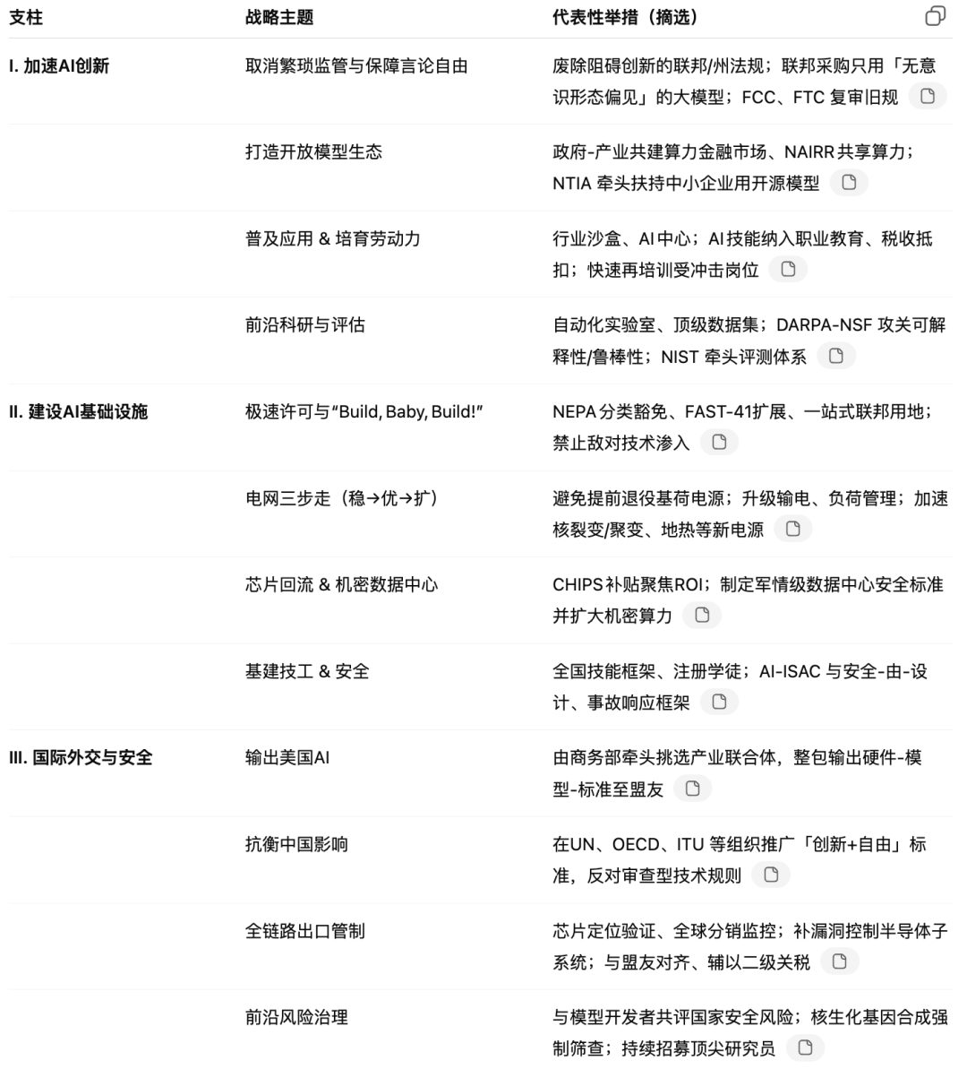 此外,“AI行动计划”还在协调全球保护措施、确保美国政府前沿模型国家安全风险评估领先地位、加强生物安全领域投资等三方面给出了具体政策建议。
