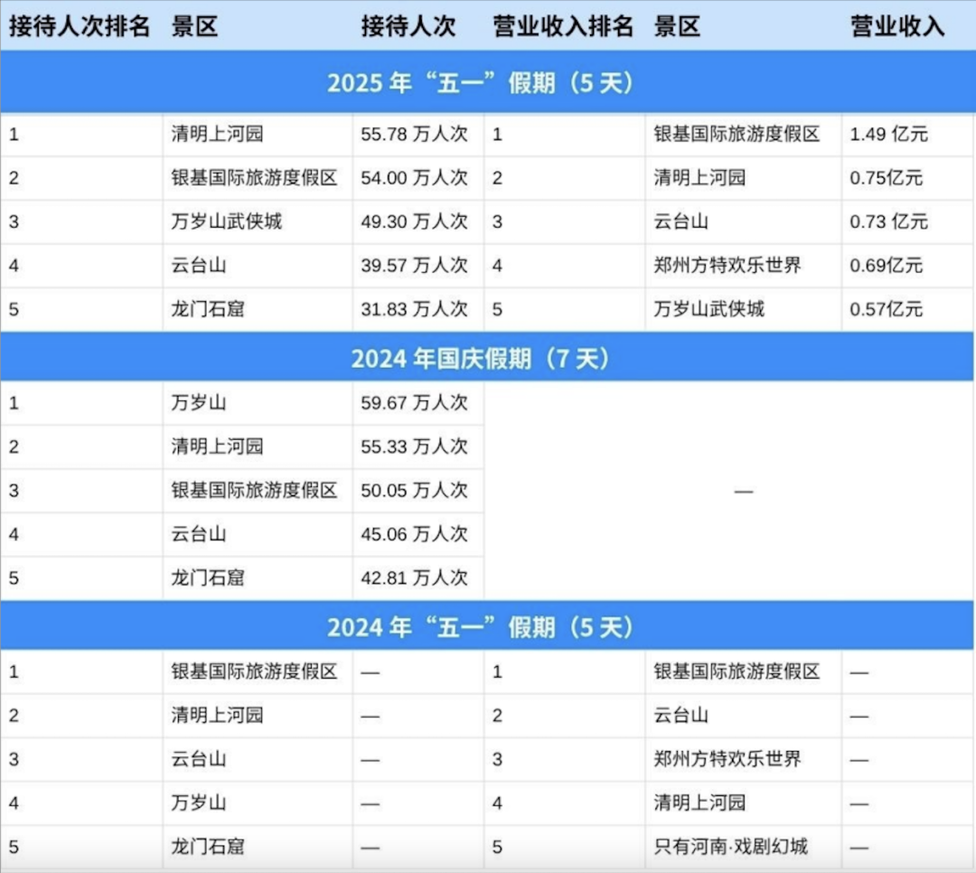 △河南景区公共假期客流量及收入前5名(数据来源/河南省文化和旅游厅;制图/九行)