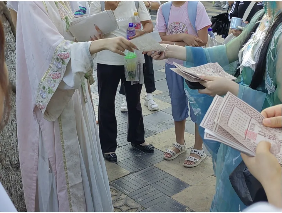 在这里和NPC互动做任务,得到的银票可以兑换小礼品或优惠券。走在园中,许多人都穿着不同朝代的汉服,大家一起cos古人。小时候背过的成语、读过的经典,化为眼前的风景,变成游戏的乐趣。