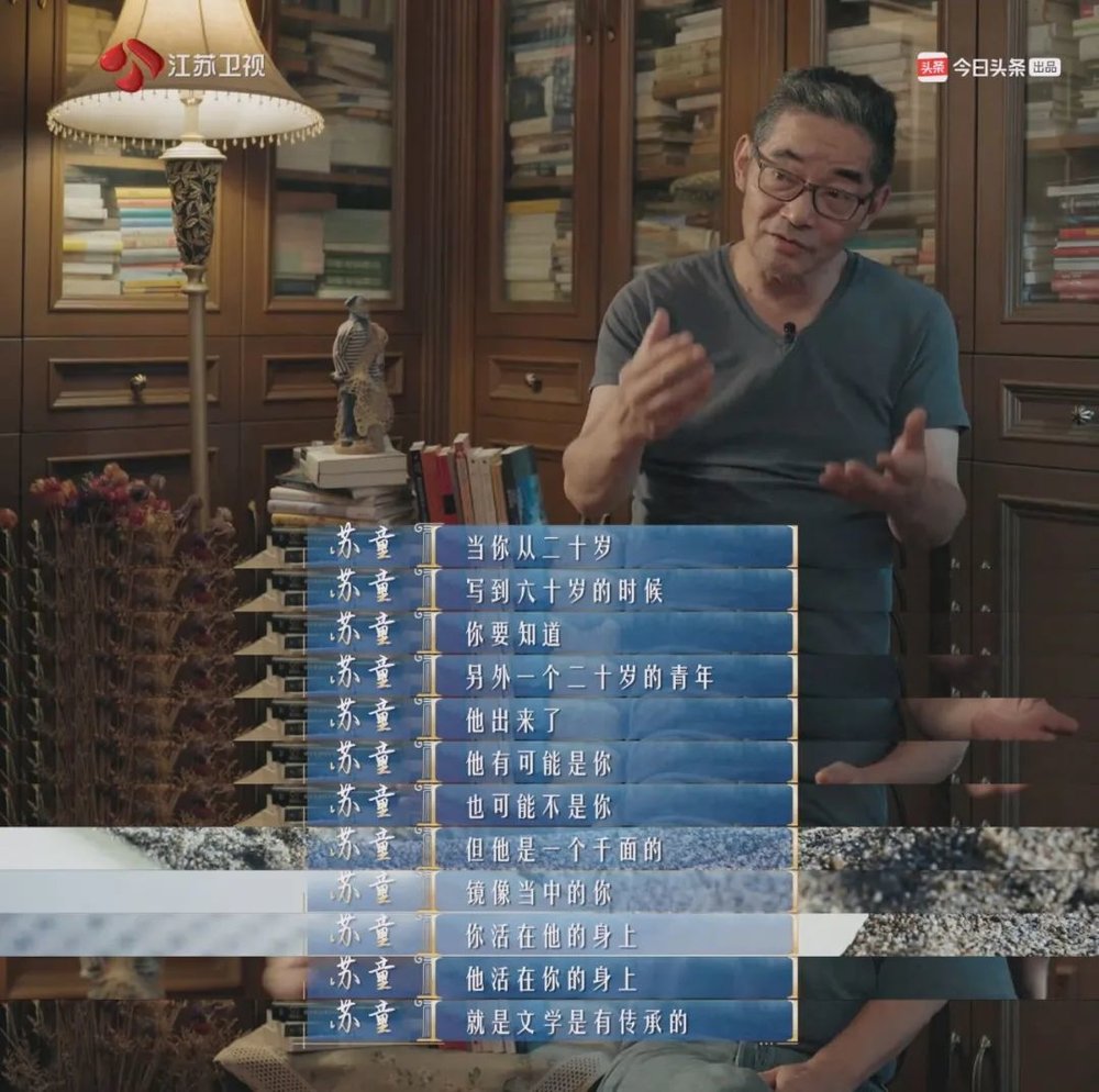 而身处短视频时代,苏童不再只是一位作家。录制综艺《我在岛屿读书》时,他最开始有些抵触和不适应。但是现在,他好像习惯了需要“经营自己的碎片”这件事。他说,我们都活在巨大的碎片里。