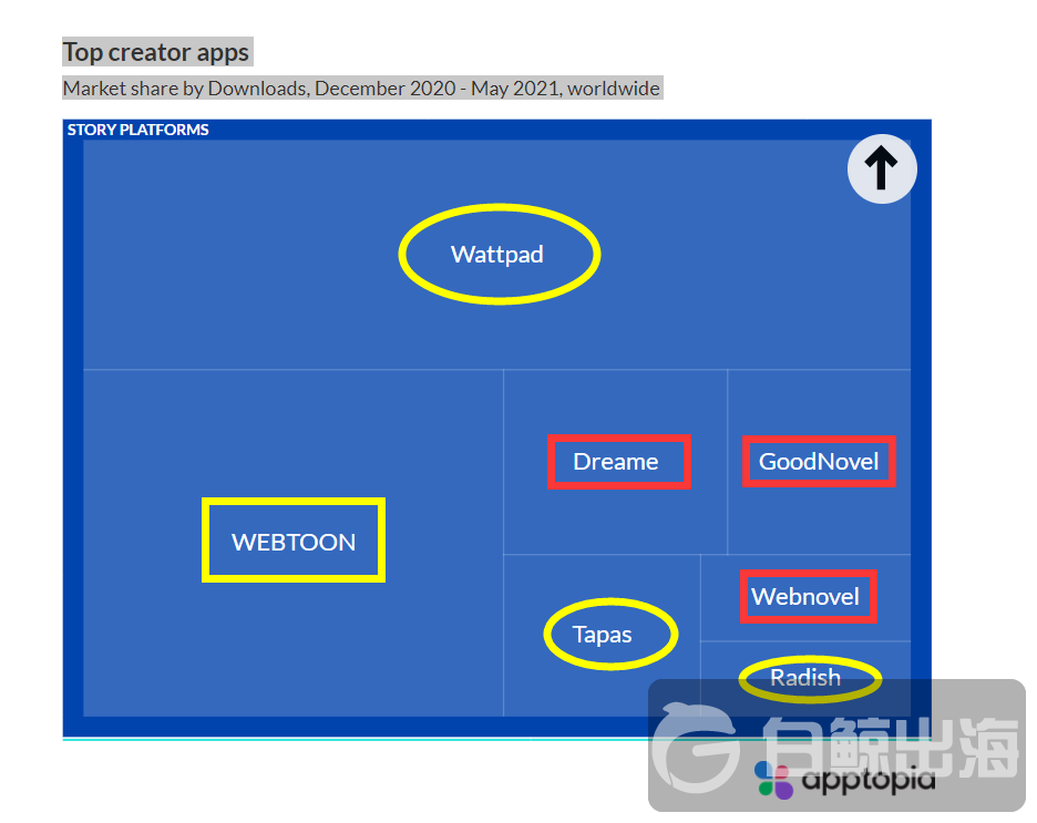 此为 2020 年 10 月-2021 年 5 月下载量最大的几个网文/漫画阅读平台,黄色为韩国 App 和韩国收购的 App,红色为中国出海 App