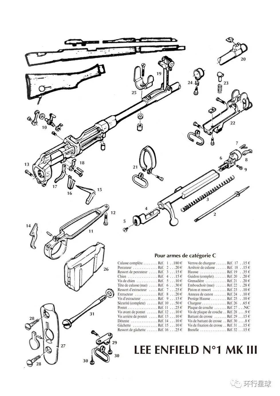 下面是李-恩菲尔德步枪 No1 MK III各个零部件的价格,例如,瞄准器35欧(约270元)、扳机簧25欧(约190元),这么一看,自己组装一把枪好像也不贵。