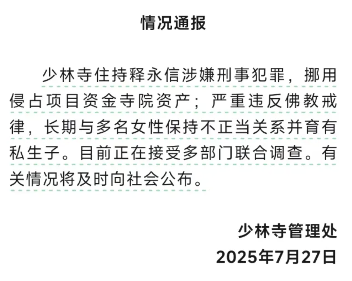7月26日,有“天下第一名刹”之美誉的少林寺突传消息:方丈释永信被带走调查。据少林寺官方网站7月27日消息,少林寺住持释永信涉嫌刑事犯罪,挪用侵占项目资金寺院资产;严重违反佛教戒律,长期与多名女性保持不正当关系并育有私生子。目前正在接受多部门联合调查。有关情况将及时向社会公布。
