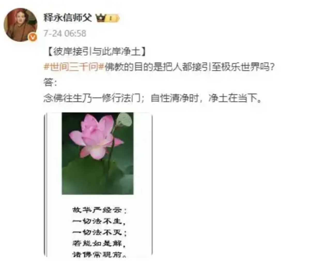根据公开报道,释永信最近一次公开露面是在20天前,当时他出席了少林寺全体僧众会议。而释永信认证的新浪微博账号最新更新停留在7月24日,此后未有新的动态发布。