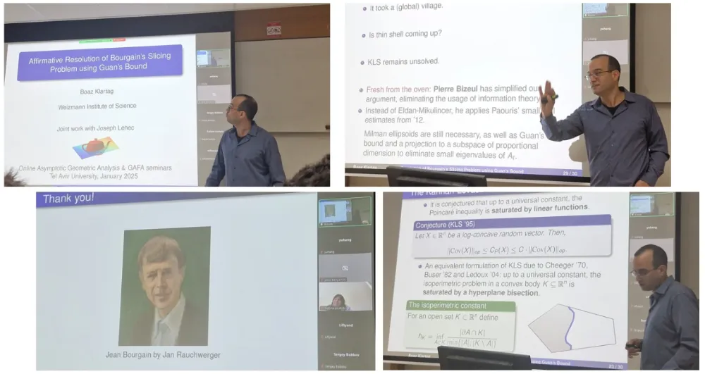 Bo’azKlartag对这个猜想、它的历史、证明的一些成分以及仍然悬而未决的相关猜想进行了精彩的演讲。未来甚至有可能确定常数c的精确值。|图源:Qingyang Guan,Joseph Lehec and Bo’az Klartag SolvedTheSlice Conjecture!|Combinatorics and more
