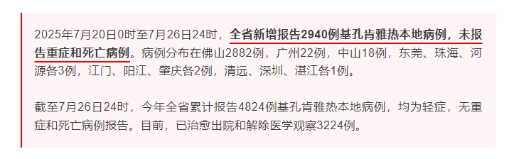传播速度快,是本轮基孔热引起广泛关注的主要原因。广东发布微信公众号在7月27日晚间发布的数据显示,7月20日0时至7月26日24时,全省新增报告2940例基孔热本地病例,未报告重症和死亡病例。病例分布在佛山2882例,广州22例,中山18例,东莞、珠海、河源各3例,江门、阳江、肇庆各2例,清远、深圳、湛江各1例。