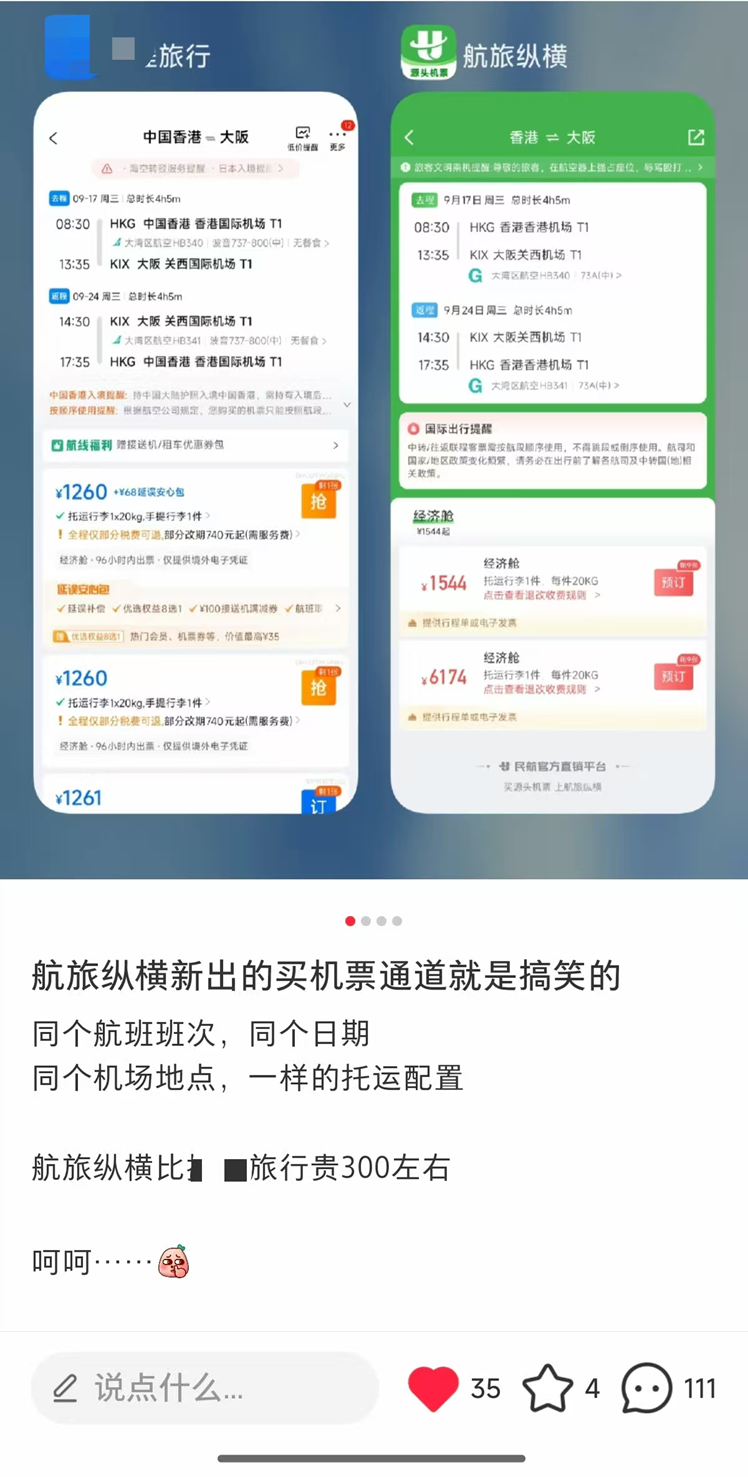 有网友以9月17日~9月24日香港—大阪的往返机票为例:“同个航班班次、同一个日期、同个机场地点、一样的托运配置,航旅纵横比OTA贵300左右。”