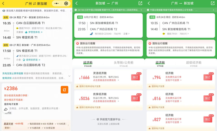 不仅如此,笔者换了个OTA对比,以广州往返新加坡的航线为例,发现还是OTA的价格更好,而且在航旅纵横上只能分别购买单程和返程,同一个航班班次有时不能在同一个界面上勾选,这算不算一个小bug?