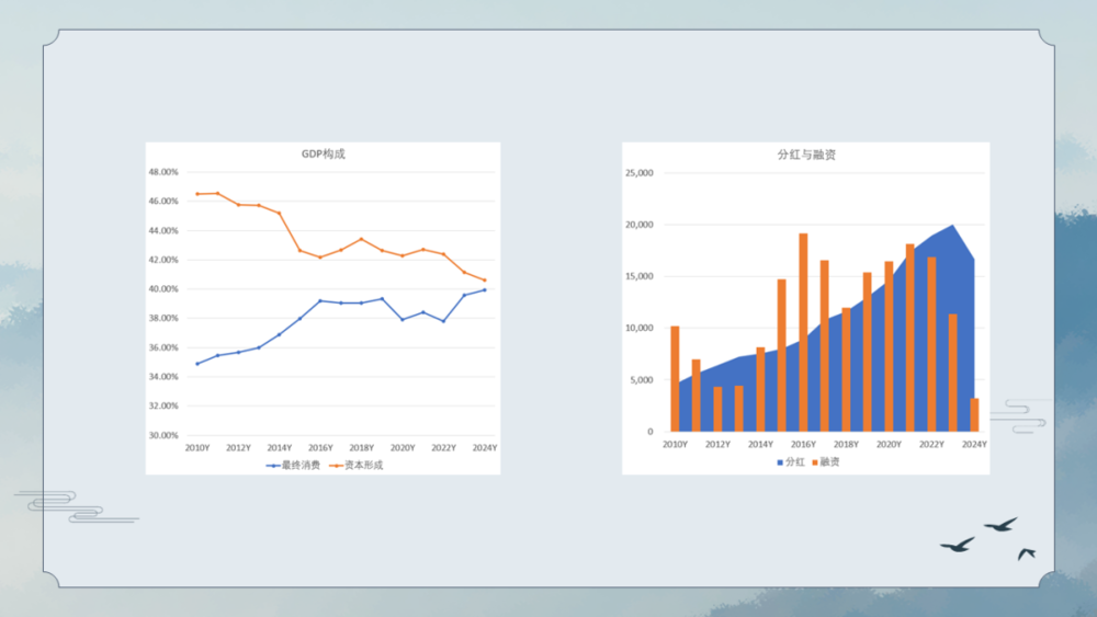 很明显,这里的左右两张图,它们是互为表里的关系。就好比上市公司的股价总是要反映基本面。一个国家金融市场的特征,必然要反映它实体经济的特征。正因为中国实体经济正在从投资主导转向消费主导,所以A股市场自然而然地也从融资主导转向回报主导。