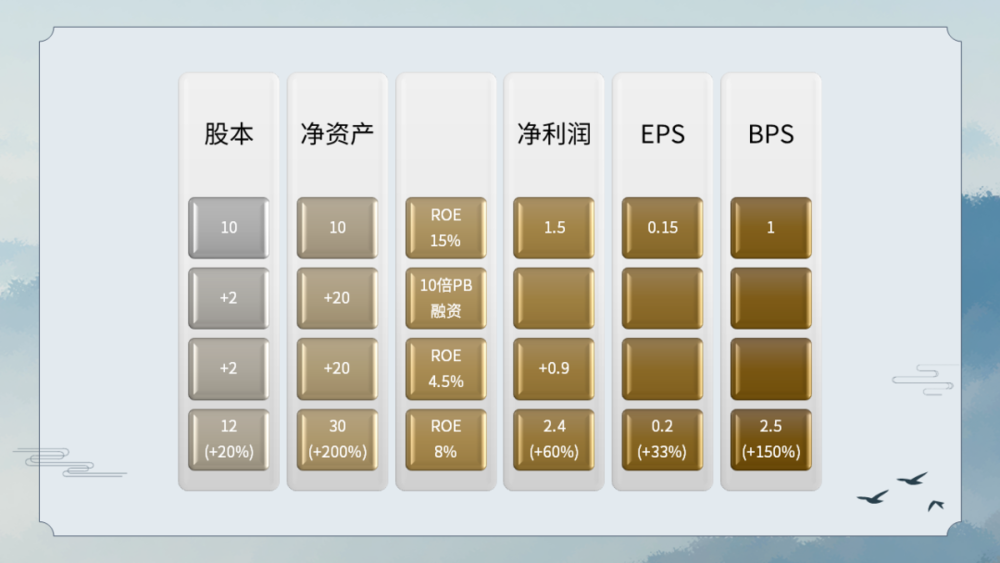 最后我们把新旧两块资产合并起来。股本从10亿变成12亿,净资产从10亿变成30亿,ROE变成8%,净利润从1.5亿变成2.4亿,EPS从0.15增长到0.2,增幅33%。通常我们投资者最关注的就是这个数字。然后每股净资产从1块钱变成2.5块钱。