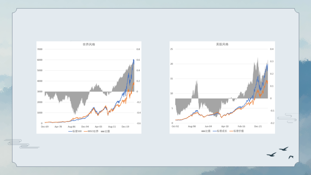 第二条,国别风格和成长价值风格几乎是同频的,至少最近20多年是这样。美国跑赢世界的时候,就是成长跑赢价格的时候,反之亦然。这是很有意思的一个点。
