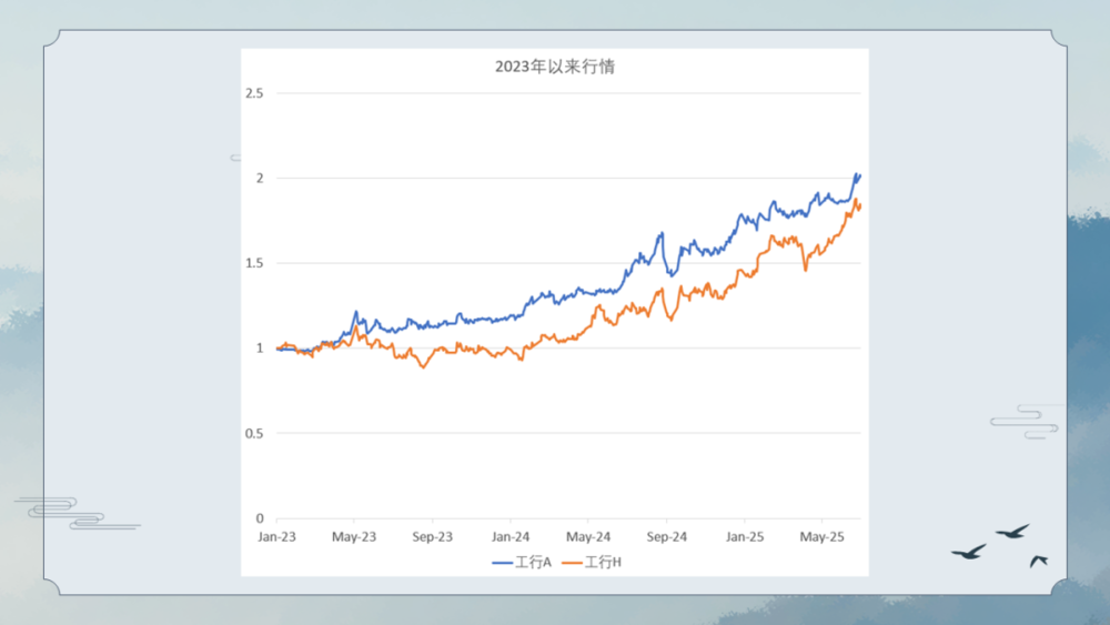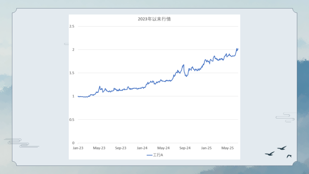 请记住这三条结论,我们后面还会再来讨论它。现在还是回到我们的A股市场。这张图是2023年初到2025年六月,A股工商银行的收盘价连续线。