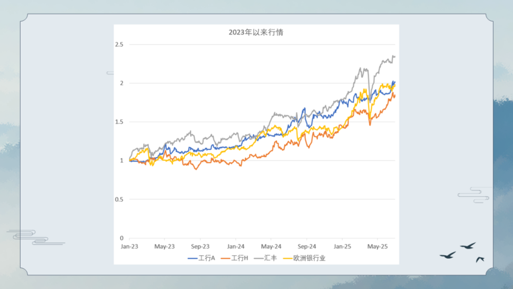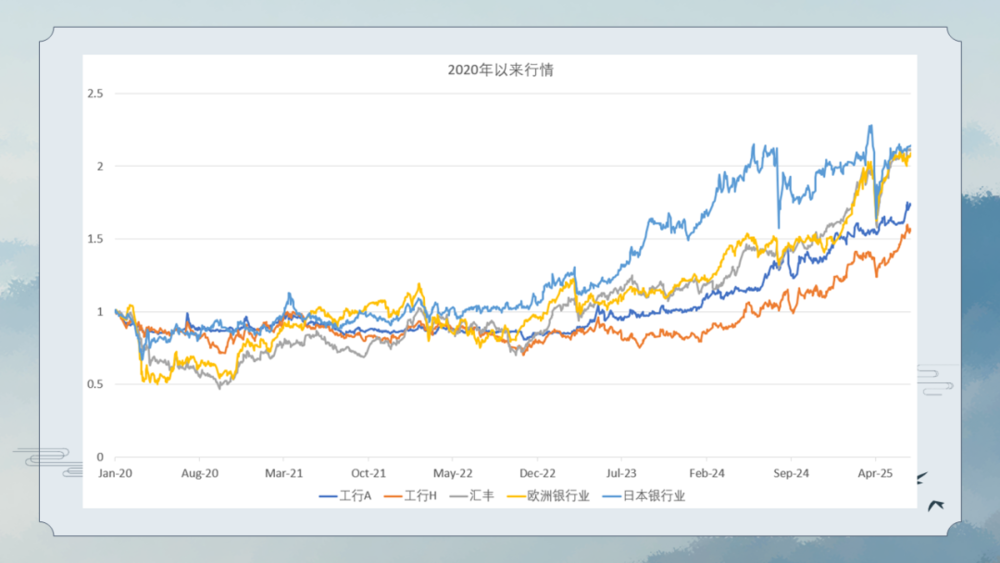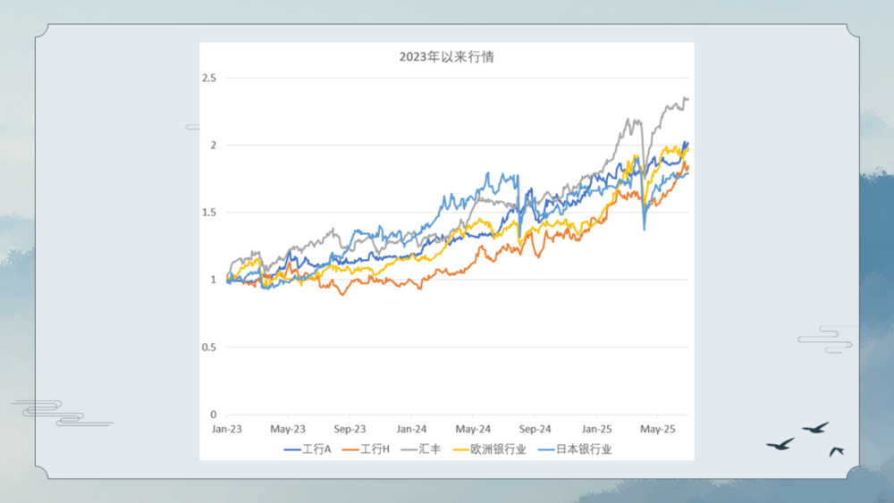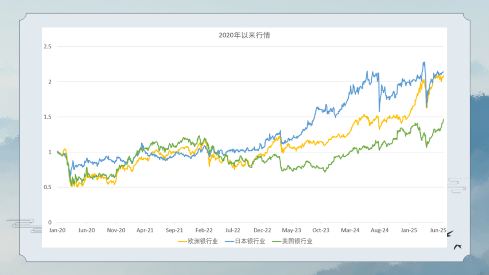 不难发现,从2020年到2022年,这三年时间内,全球银行股都是趴在原地不怎么动弹的。然后从2022年底、2023年初开始,就像是听到了发令枪一样,它们几乎同时开始启动,一路涨到今天。