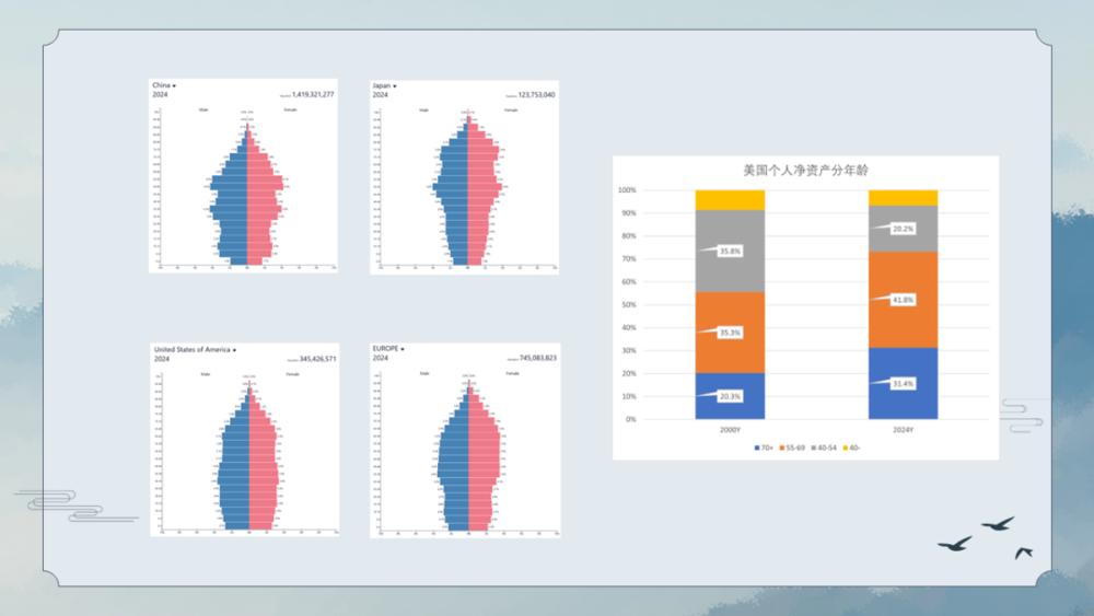 2000年,净资产量最大的是40到54和55到69这两个年龄段,各占35%左右。2024年,净资产量最大的是55到69这个年龄段,占比42%,其次是70以上,占比32%。40到54年龄段的净资产占比只剩下20%了。