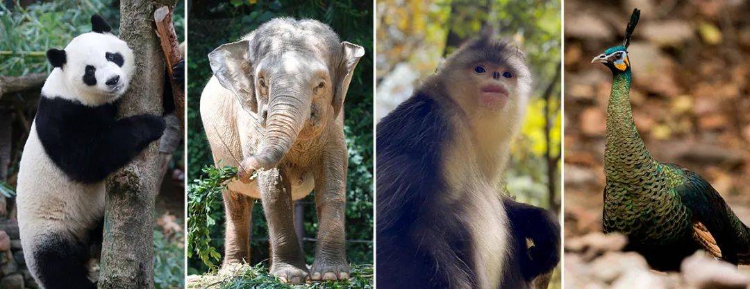 左至右分别为大熊猫、亚洲象、滇金丝猴、绿孔雀