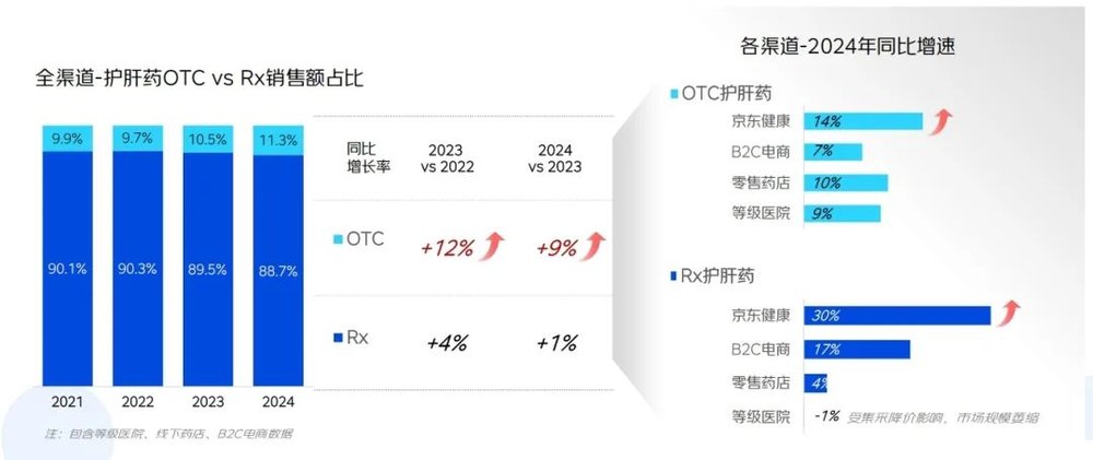 另外,护肝药全渠道OTC(非处方药)销售额快速增长,B2C(企业通过互联网直接向消费者销售产品和服务)电商平台成为集采后Rx(处方药)护肝药处方外流的主要承接渠道。