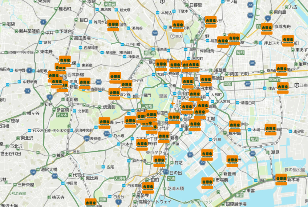 以东京为例,吉野家在新宿站、东京站等⼤站周边密集分布