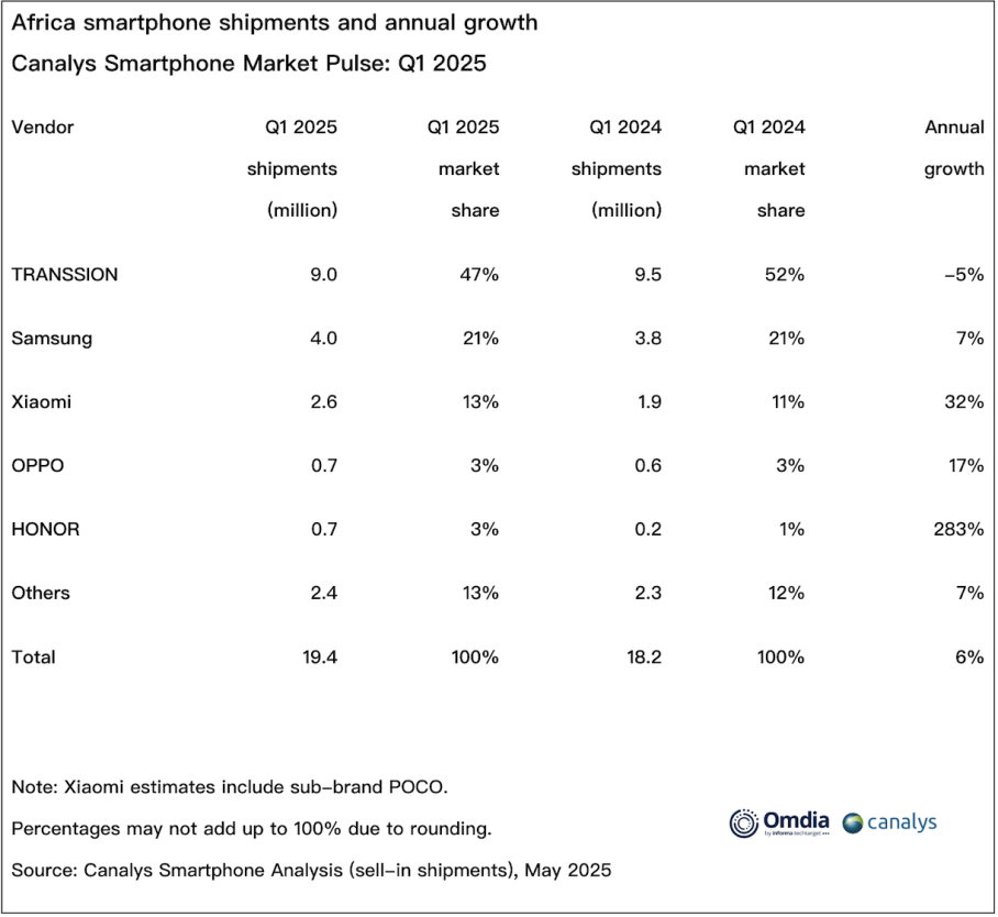Canalys统计2025年一季度非洲市场手机厂商出货量以及市场占有率情况