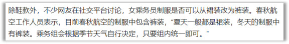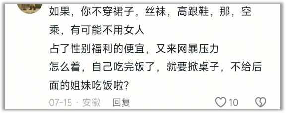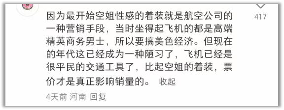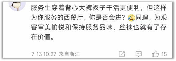 还有人表示,要求空姐穿丝袜穿铅笔裙,本来就是民航发展留下的历史糟粕。