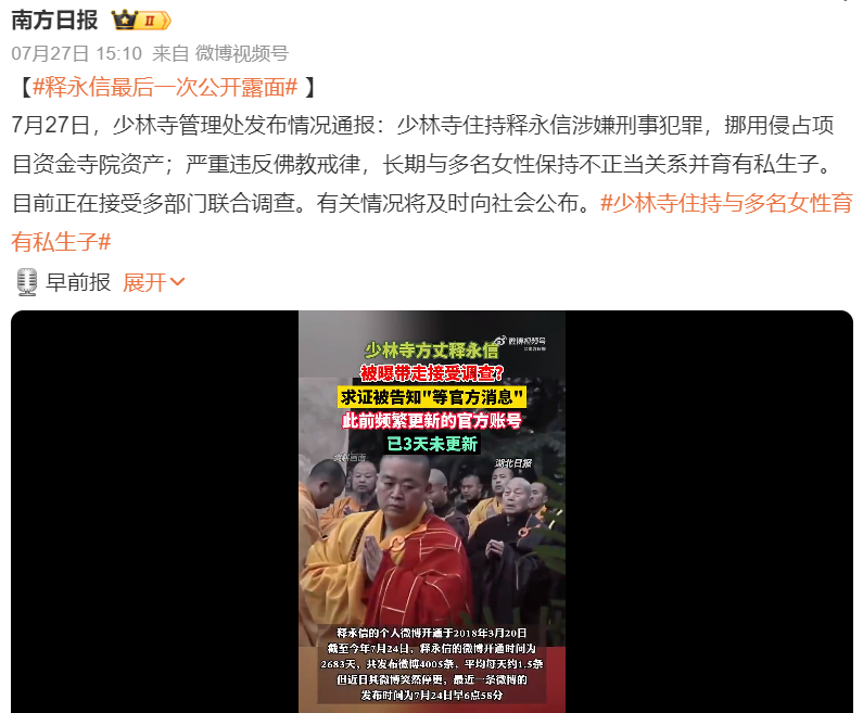 2025年7月27日晚,少林寺管理处发布通报,证实住持释永信涉嫌刑事犯罪。