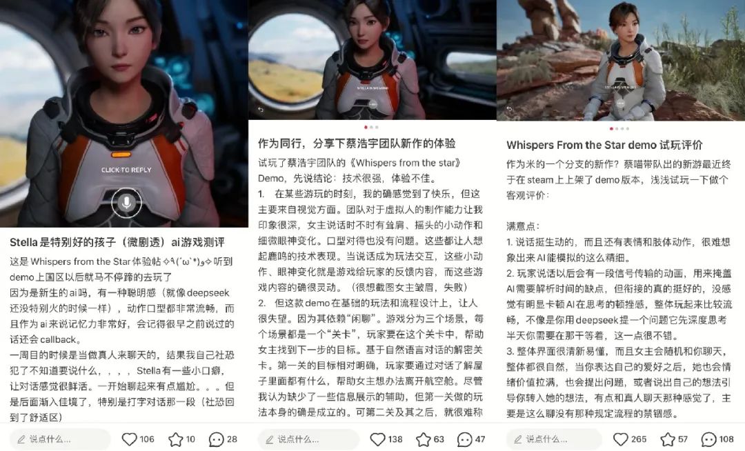 Whispers from the Star从今年3月宣布封闭测试开始就引发了海量关注,一来自然是米哈游创始人新作的名号,二来则是与AI的紧密联系。这款游戏主打“AI实时交互”,没有主线任务、也没有传统意义上的“玩法”,它构建的是一个孤独的外星球求生场景,而玩家与AI女主角Stella之间的对话,决定了故事的全部走向。