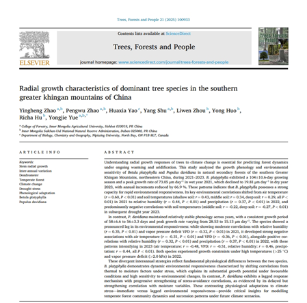 发布于该期刊的研究《Radial growth characteristics of dominant tree species in the southern greater khingan mountains of China》(译为:中国大兴安岭南部优势树种的径向生长特征)指出,大兴安岭南部过去几十年气温以每十年0.36℃的速度上升,同时降水减少。