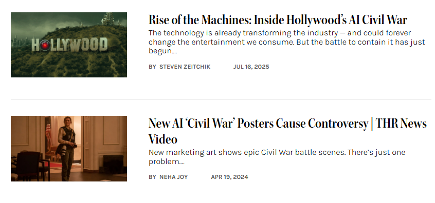 《好莱坞报道者》文章“机器的崛起:好莱坞的人工智能内战”标题中出现了AI Civil War