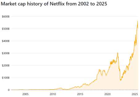 目前Netflix市值已突破5000亿美元,是迪士尼、康卡斯特(环球影业母公司)和华纳兄弟Discovery市值的总和。