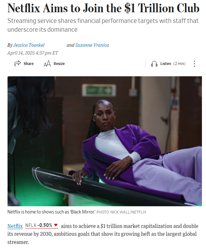 《华尔街日报》也披露,Netflix的内部目标是到2030年让年收入增长一倍,让市值达到一万亿美元。