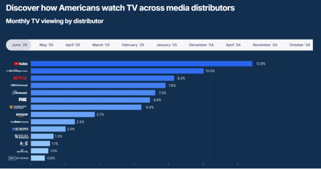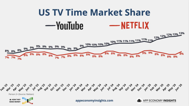 但到了2025年6月,Netflix仍然维持8%不变,但YouTube已经增长到了13%。这就意味着Netflix只是随着行业同步增长,而YouTube在快速蚕食流媒体竞争对手的收视时间,当然也包括Netflix的收视时间。