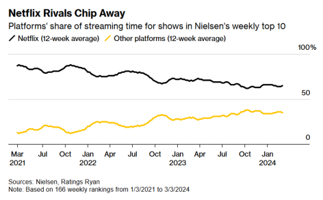 2021年时Netflix的剧集占据了超过80%的流媒体时间,现在只有不到50%了(虽然优势还是很明显)。