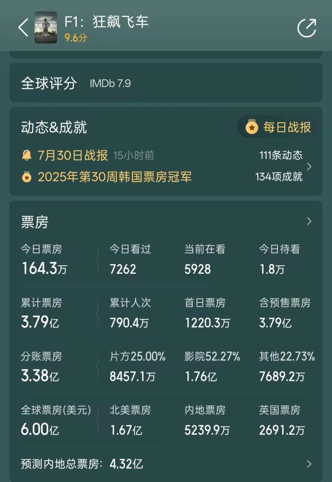 苹果此次突然加速入局,背后离不开由其出品的电影——《F1:狂飙飞车》的强势表现。猫眼专业版上的数据显示,影片的全球票房已经达6亿美元,是苹果出品电影票房之最;国内市场累计票房3.79亿,上映周期也延期至8月26日;社媒上,关于电影的讨论更是不绝于耳,且融进了日常的F1赛事话题中。
