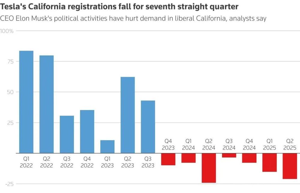 ▲特斯拉在加州的注册量连续第七个季度下滑