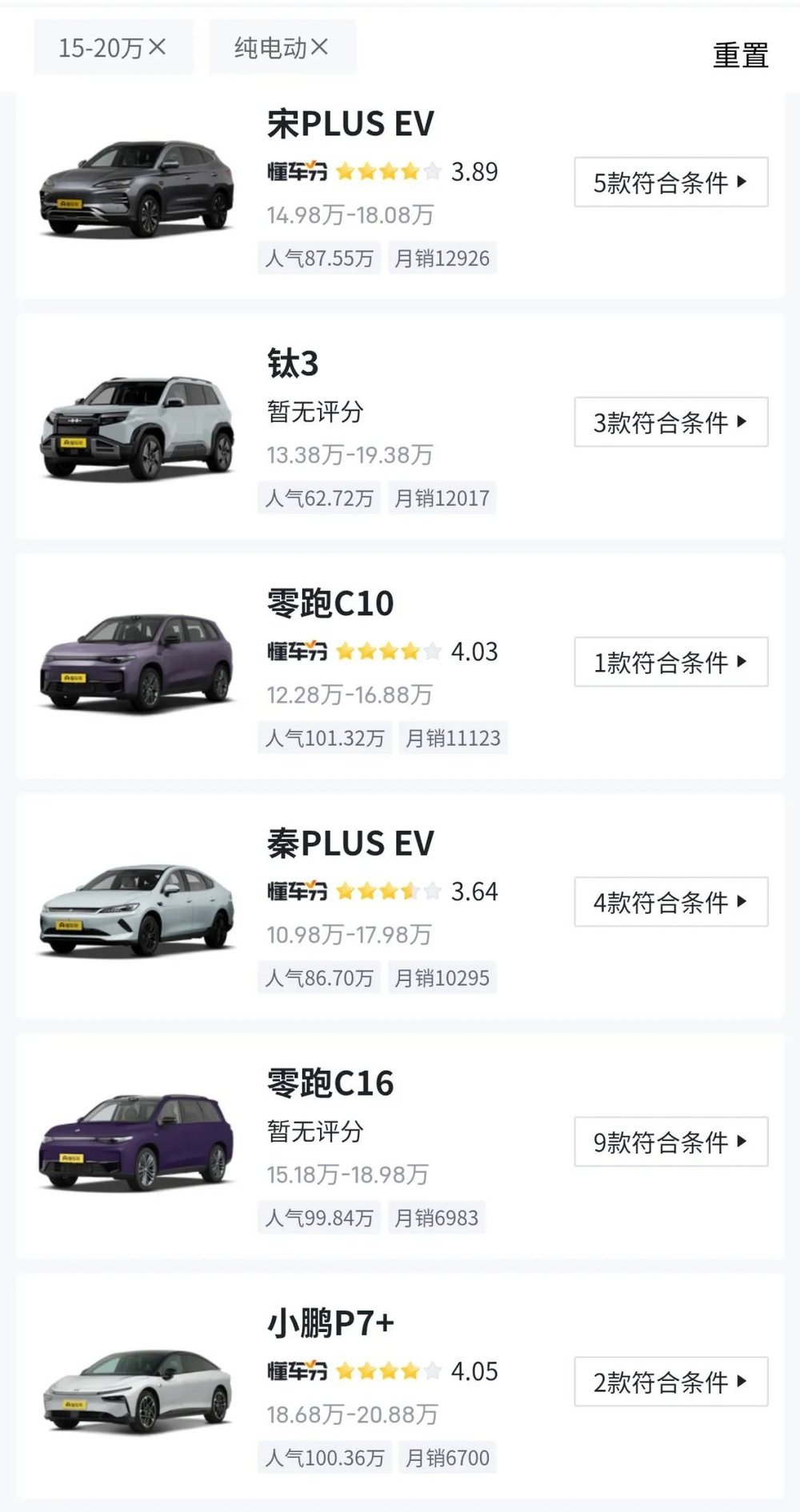 ▲懂车帝上15万~20万区间内的纯电动车型有200余款