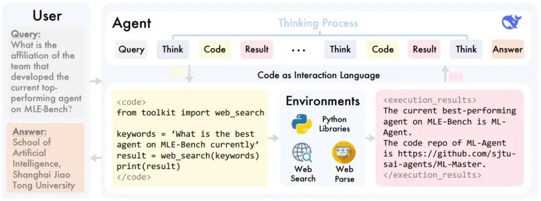 具体来说,如下图所示,X-Master是深势科技开发的一套工具增强型推理智能体:给定一个用户查询,该智能体首先会开始思考过程。在此过程中,工具调用等与环境的交互是通过生成Python代码片段实现的。执行所得到的结果将被附加到智能体的上下文中,进而丰富其理解并为其后续思考提供信息。