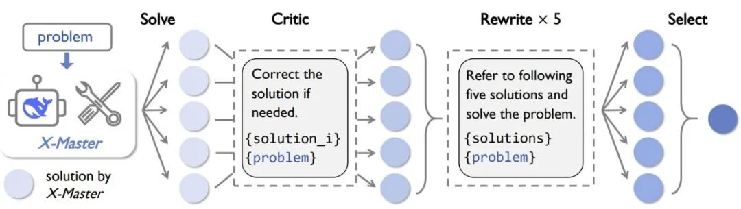 该工作流程是让X-Master扮演不同角色,以在推理时提高解答的质量。其中包括:(1)求解器(Solver)生成五个初始解答;(2)批评器(Critic)对初始解答进行细化;(3)重写器(Rewriter)综合所有五个解答并生成五个新解答;(4)选择器(Selector)挑选最佳解答。