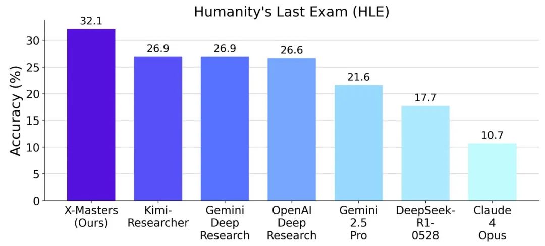 X-Masters在高难度的Humanity's Last Exam(HLE,人类最后考试)基准上创造了新的SOTA记录,得分达到32.1%,超过了OpenAI和谷歌的Deep Research(分别为26.6%和26.9%),在2025年六月底,成为了首个突破HLE 30%大关的方案。