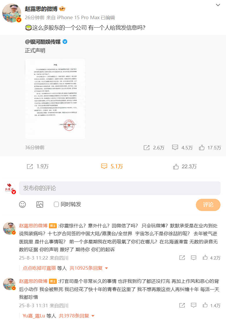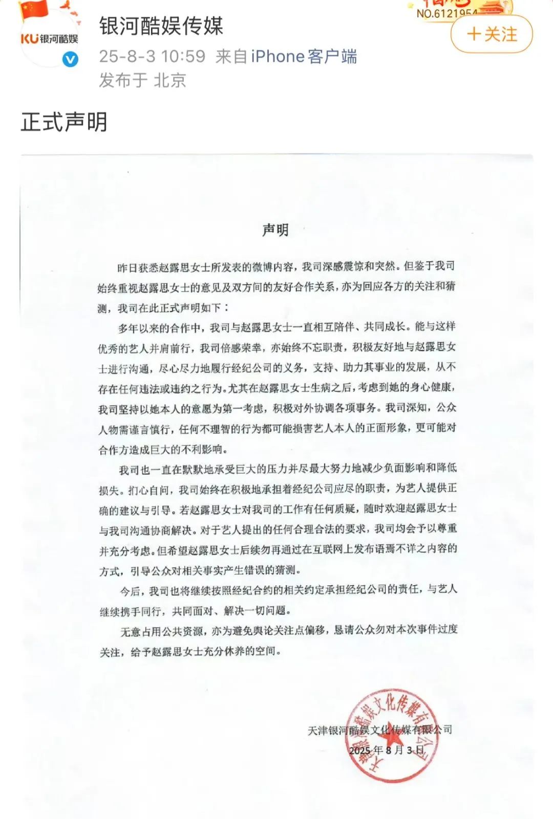 针对上述指控,银河酷娱传媒8月3日声明称:“昨日获悉赵露思女士所发表的微博内容,我司深感震惊和突然。”