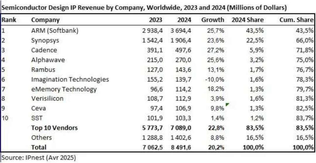 2024年,全球设计IP市场Top 10厂商合计营收70.89亿美元,同比增长22.8%,市场份额从2023年的81.7%提升至83.7%。其中,ARM、Synopsys两家企业合计占据66%的市场份额,较2023年提升4.5个百分点。前四大供应商(ARM、Synopsys、Cadence、Alphawave)合并占据 75% 的市场份额,而2023年为72%。