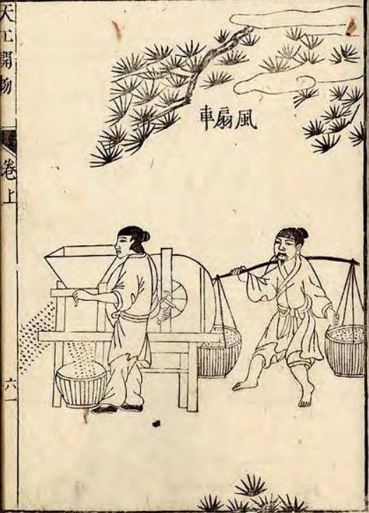 汉代风扇车的发明极大地提高了谷物加工和筛选的效率(来源:《天工开物》)